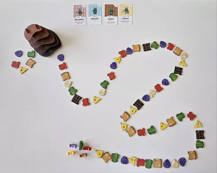 Durante la configuración, se crea un rastro de comida. En el turno de cada jugador, pueden mover cualquier hormiga a la siguiente comida en el camino que coincida con su color (hormiga roja a manzana, hormiga púrpura a uvas, etc). Luego el jugador toma la ficha de comida directamente delante o detrás de la hormiga, guardándola para el final del juego.