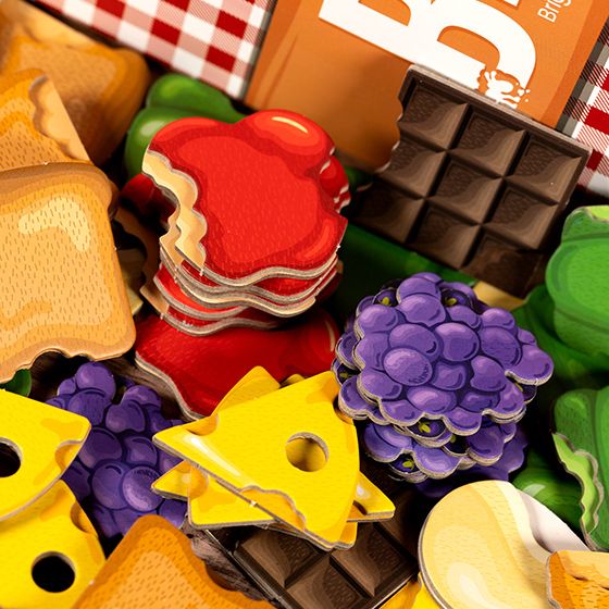 Además del juego, estas fichas son lo que más nos enorgullece en Bites. Nadie ha hecho algo así en un juego de mesa. Con las fichas de doble capa, ambas capas se cortan de forma única, por lo que las fichas de comida son verdaderamente tridimensionales y se sienten como si se hubieran tomado mordidas.