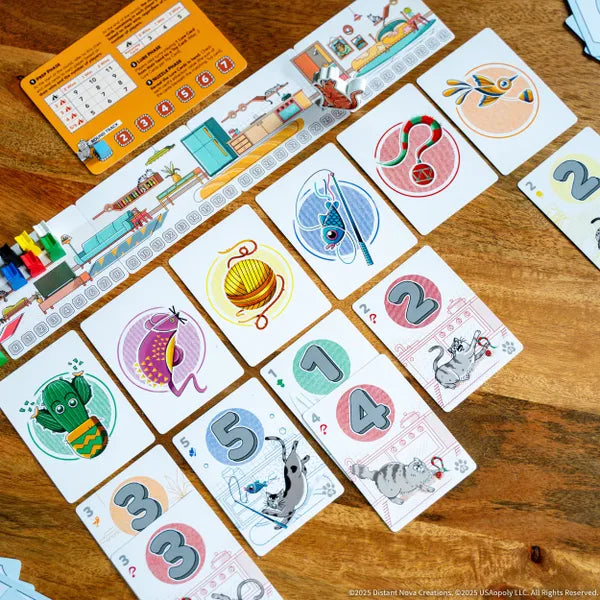 En cada ronda de Cat Between Us, primero sacas una carta del mazo y luego colocas la ficha del gato en el espacio numerado de la pista que coincide con el número diminuto de la tarjeta. Barajar la baraja, luego repartir a todos los jugadores su tamaño de mano actual.