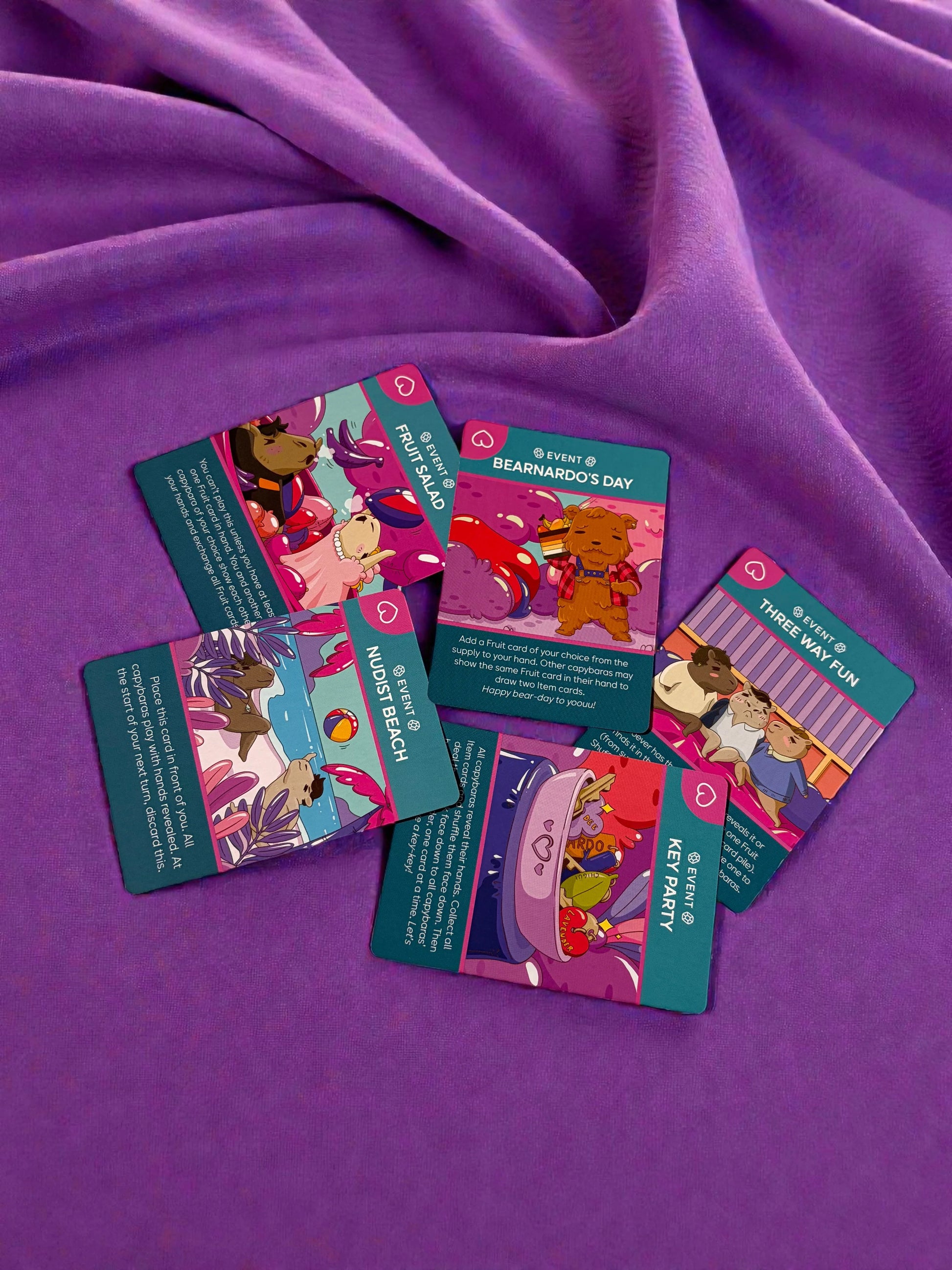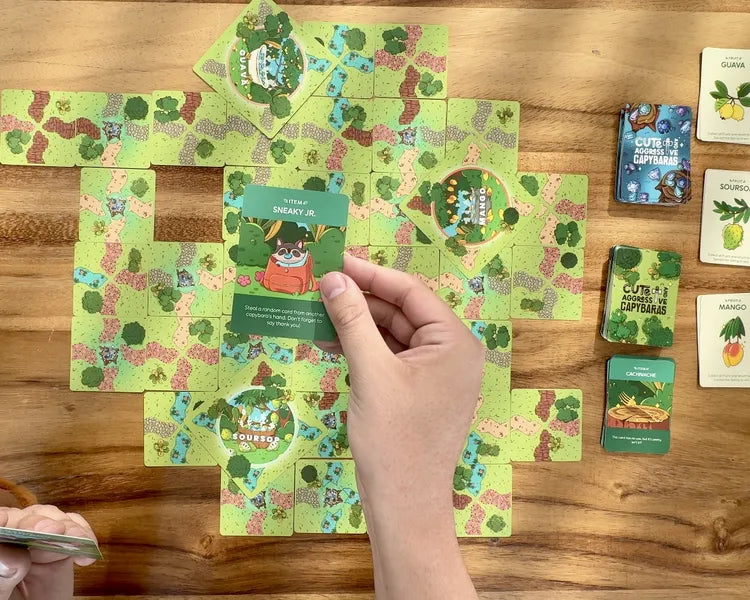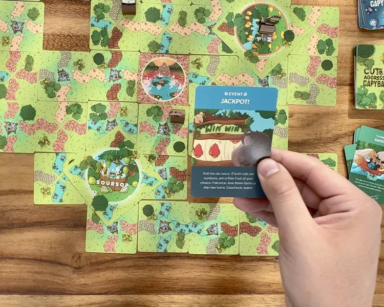 Sé el primer capybara en reunir todas las cartas de fruta de cada loseta Hot Bath (o robárselas a otros jugadores) y vuelve a la loseta Sacred Hot Spring para reclamar la victoria!