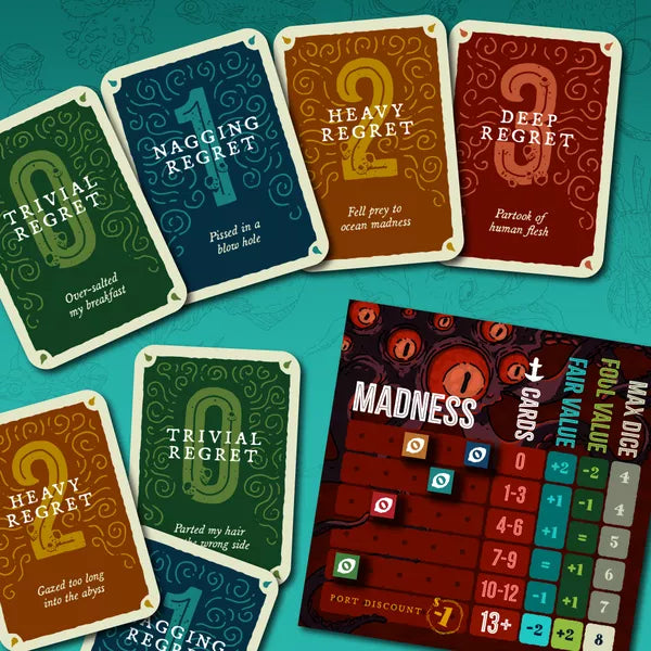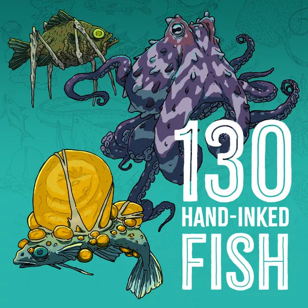 Examina el tamaño de las sombras en la espalda de 9 bancos de peces diferentes a tres profundidades, determinando lo que crees que puedes permitirte pescar y si quieres arriesgarlo por una recompensa potencialmente mejor. Voltea peces, gasta dados, y añadelos a tu colección - pero cuidado con revelar y atrapar habilidades que pueden tener varios efectos en el juego! A medida que tus ojos espian más y más cosas espantosas, recogerás cartas de Remordimientos - las cuales suben tu locura pero también te dan acceso a más dados y aumentan el valor de los peces más raros. Es un escenario de riesgo/recompensa a medida que equilibras tu locura, sabiendo que al final del juego el jugador con el mayor valor de Regrets tendrá que desechar su pescado montado más valioso.