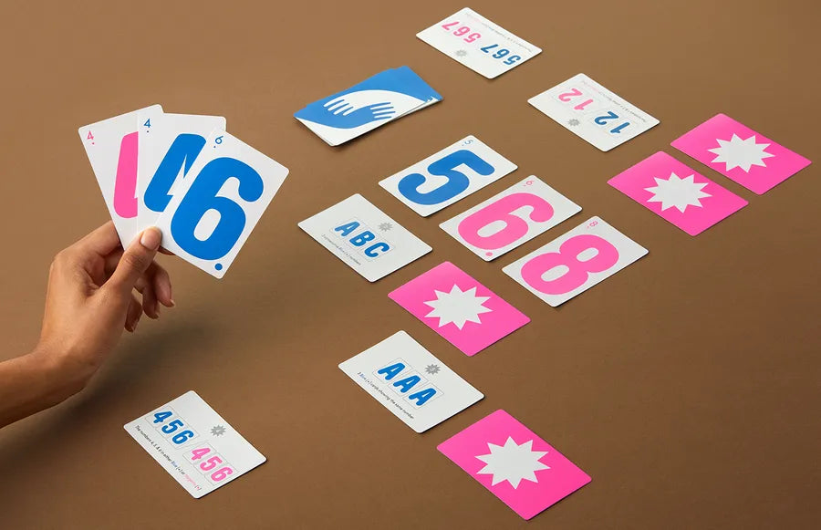 Las tarjetas vienen numeradas 1-8 en magenta y azul con múltiples copias de cada tarjeta. Cada jugador tiene un objetivo personal, con la cara hacia arriba, con un objetivo público que está disponible para todos los jugadores, con objetivos que son algo así como tener cuatro tarjetas azules en secuencia, tener tres del mismo número par, o tener dos tarjetas magenta que se suman a una tercera tarjeta magenta.