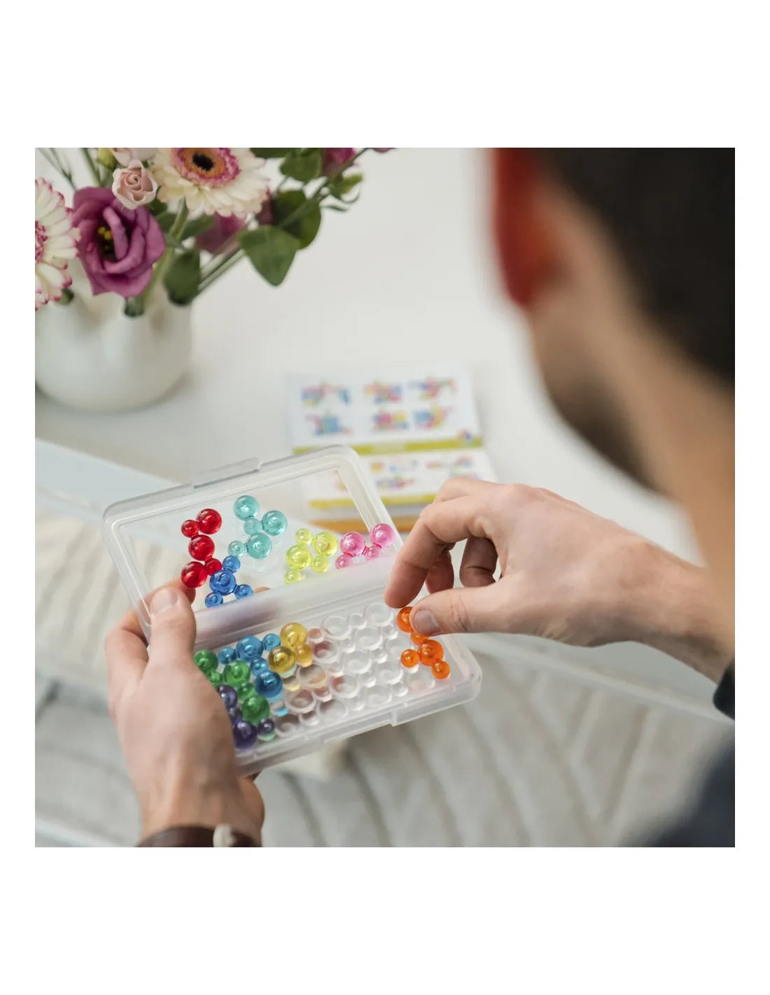 IQ Bubbles viene en un formato compacto en una caja transparente con tapa para poder llevarlo a donde quiera que vayas.