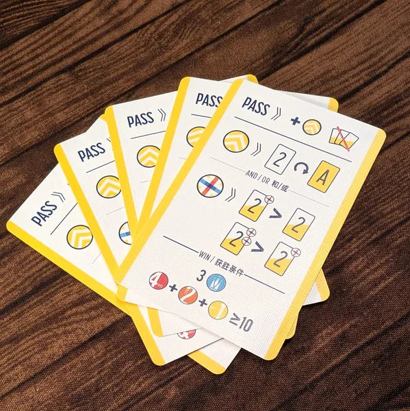 PASS es un juego de escalera en el que cada carta tiene un lado potencialmente mejorado con otro valor. Los jugadores pueden pasar su turno para tomar un token PASS y usarlo en una ronda posterior para cambiar una carta a su lado mejorado.