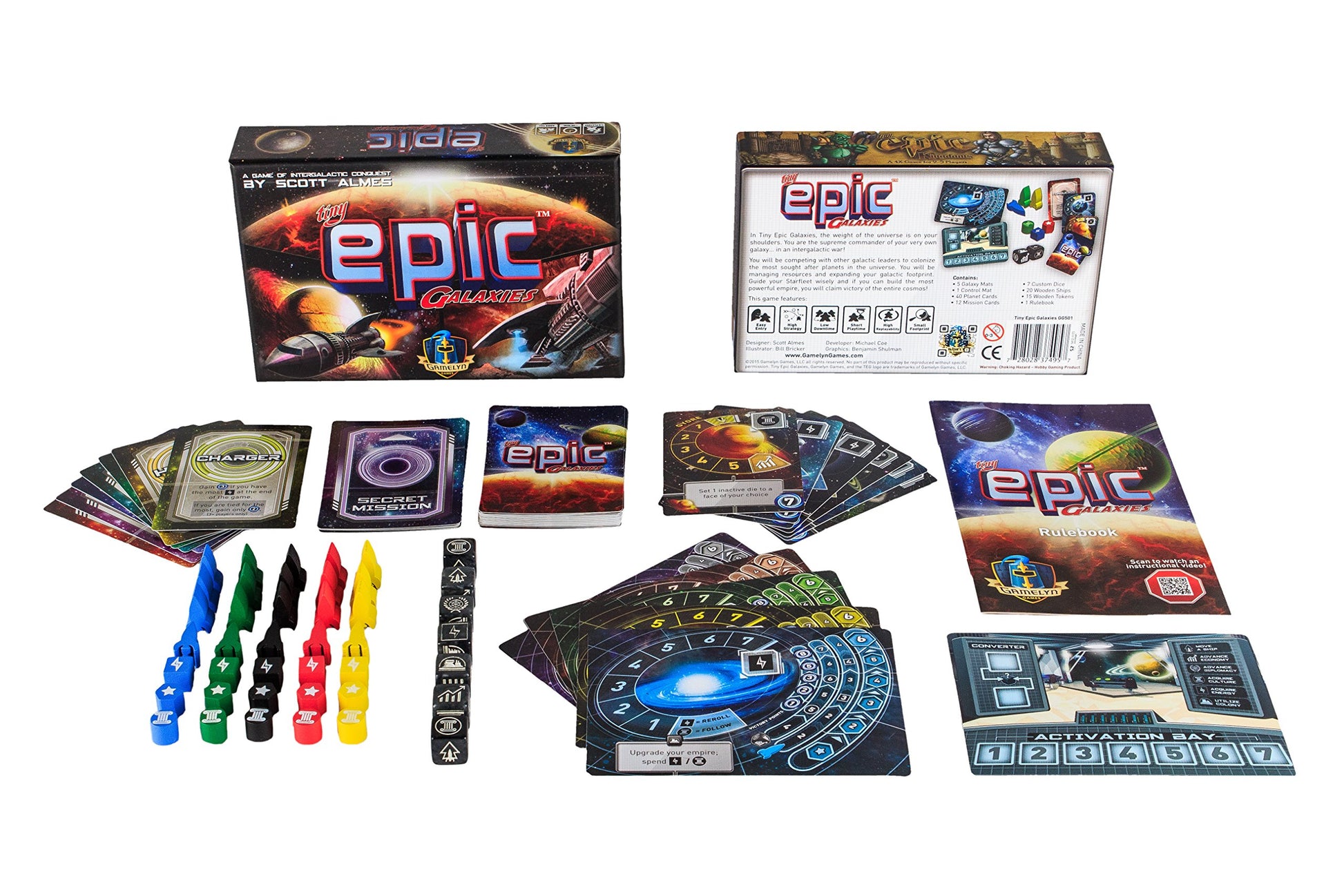 En Tiny Epic Galaxies cada jugador controla un imperio galáctico, con el objetivo de expandir su influencia mediante la adquisición de planetas altamente disputados y aumentar su armada cósmica. El juego gira en torno a una innovadora mecánica de combo de lanzamiento de dados. El número de dados que lanzas está determinado por la fuerza de tu galaxia. Cada dado está grabado con símbolos que representan las diversas acciones que puedes realizar, como mover una nave espacial, aumentar tu cultura o recursos energéticos, o avanzar en tu influencia política o económica sobre planetas recién descubiertos.