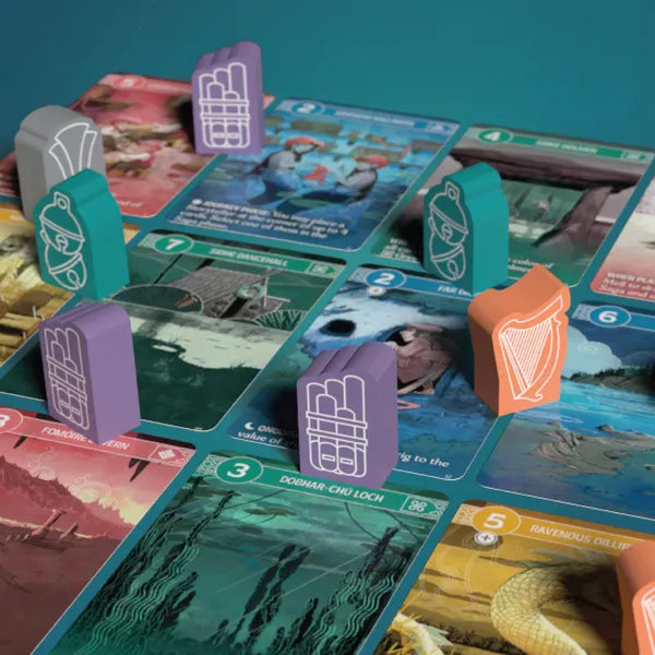 Viaje al otro mundo en Tír na nÓg colocando narradores entre tarjetas de la historia en la cuadrícula compartida. Cuando todos los storytellers hayan sido colocados, en orden inverso del jugador las cartas de draft y añádelas a tu mano. De tu mano, luego agregas cartas a tu tablero personal: una carta en mano, una carta jugada. Al final de cinco rondas, puntúa cada fila según las reglas de la tarjeta de gol correspondiente, y gana puntos por tener las tarjetas de historia más conectadas de cada color. La puntuación más alta gana.