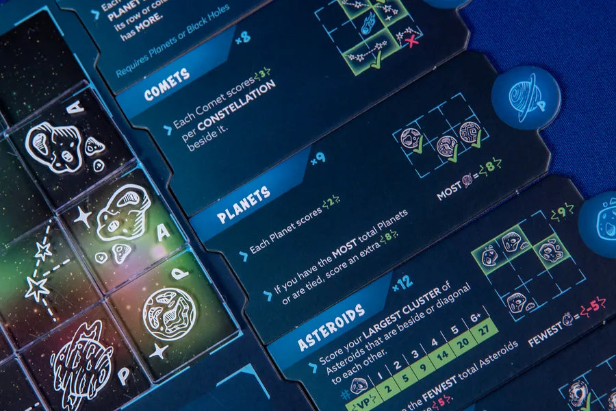 Constelaciones, asteroides, cometas, planetas y agujeros negros todos puntúan de manera diferente! Con 10 condiciones modulares de puntuación en la caja, puedes mezclar y combinar para 32 configuraciones diferentes. El que encuentre su mayor puntuación en las estrellas gana.