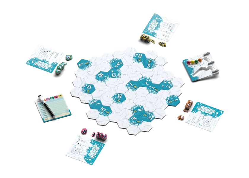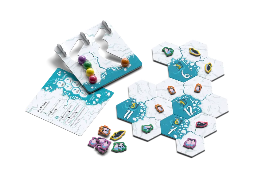 Estratégicamente coloca tus pingüinos para formar grupos y reclamar los peces para anotar la mayor cantidad de puntos! El orden de turno importa mucho; en Waddle, es rastreado por canicas en una pista de dos columnas!